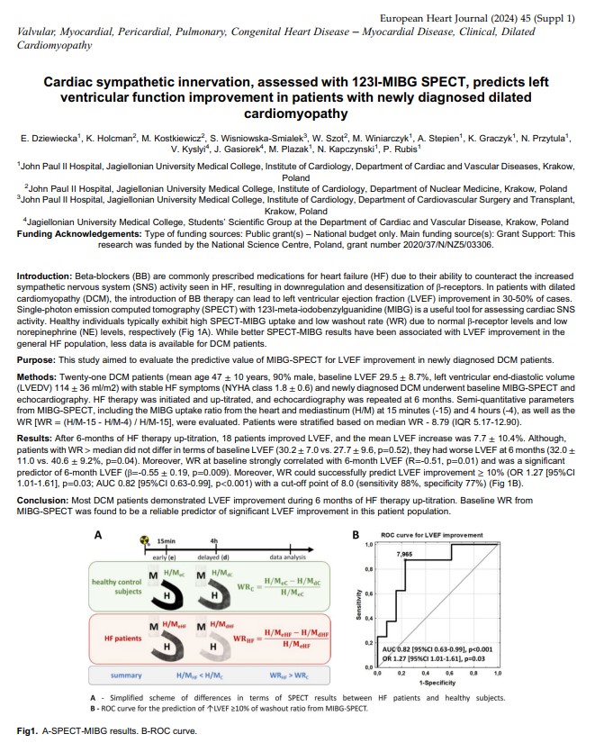 E. Dziewięcka, et al. Cardiac sympathetic innervation, assessed with 123I-MIBG SPECT, predicts left ventricular function improvement in patients with newly diagnosed dilated cardiomyopathy. European Heart Journal 2024; 45:Suppl_1, ehae666.2060; 10.1093/eurheartj/ehae666.2060.